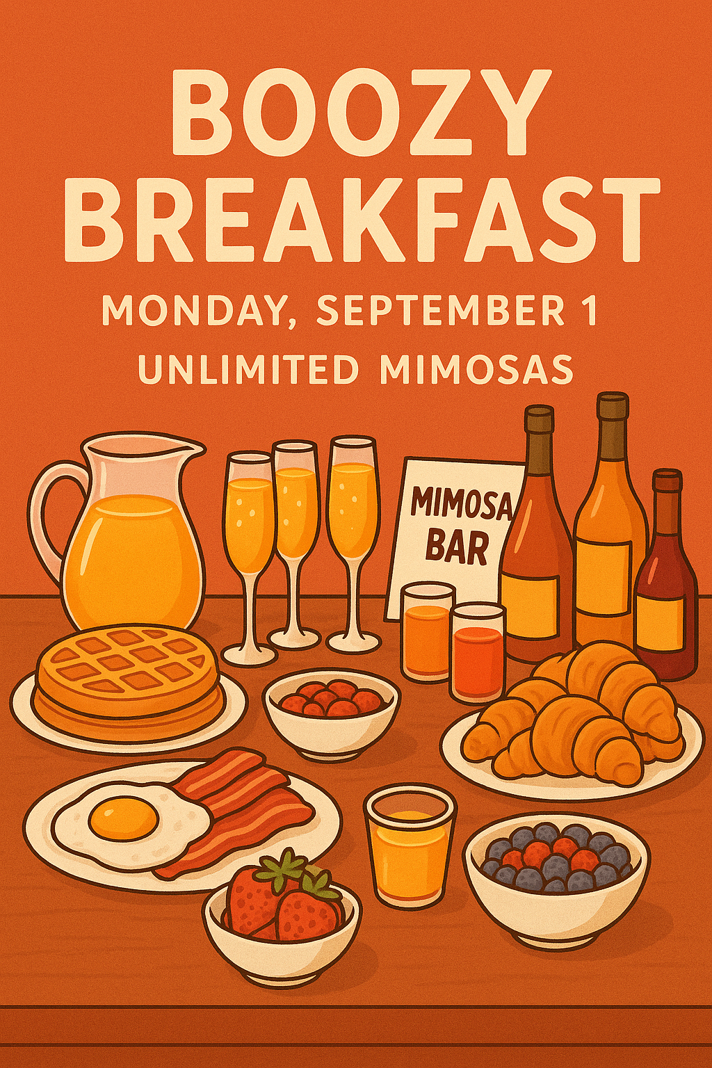 Kom maandag 1 september genieten van onze boozy versie van het ontbijtbuffet en geniet twee uur onbeperkt van mimosa's. De volledige prijs is €45pp* en omvat alles van het onbeperkte ontbijtbuffet, met als bonus bodemloze mimosa's.